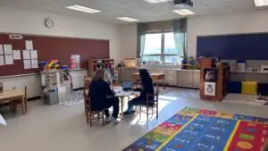 [Photo Credit: Bella Flores] “Rising Educators teachers Mrs. Sarah Juart [left] and Mrs. Marianne Brady [right] lesson plan in the new preschool lab.”